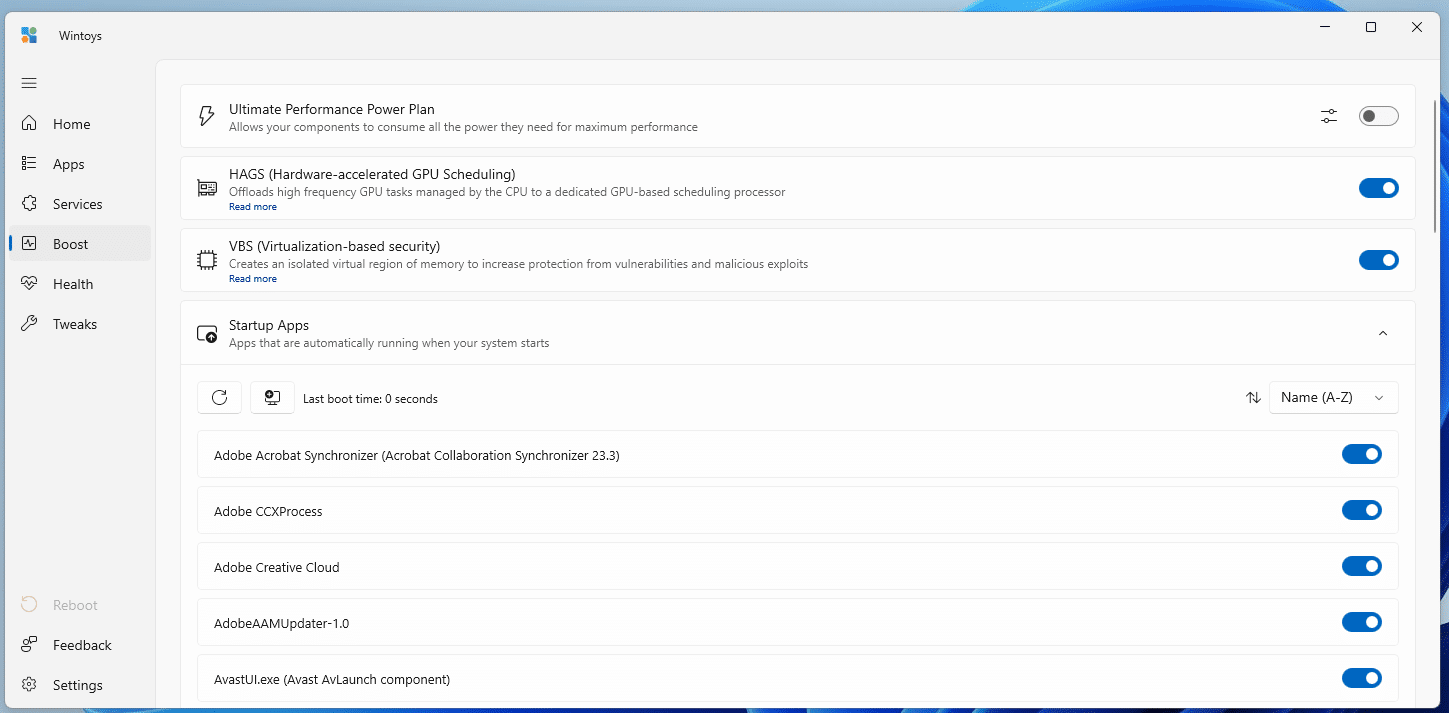 1 – Open the program and click on the “Health” tab. This is where you will find important features (such as those that allow faster startup), which can be activated/deactivated using sliders or a drop-down menu. To improve startup speed, turn on Fast Startup and Hibernation. Finally, the “20%” sign indicates the amount of memory reserved for the fast access copy of the system that the computer may have to use to boot. This is the minimum required for a quick start, so we recommend leaving this parameter as is; For example, if you increase it to 40%, this will also make reactivation faster after hibernation.