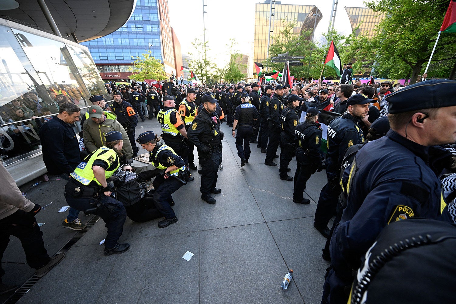 During the afternoon of Saturday, A crowd of demonstrators gathered in the central square of the Swedish city before marching towards the competition siteWaving Palestinian flags.